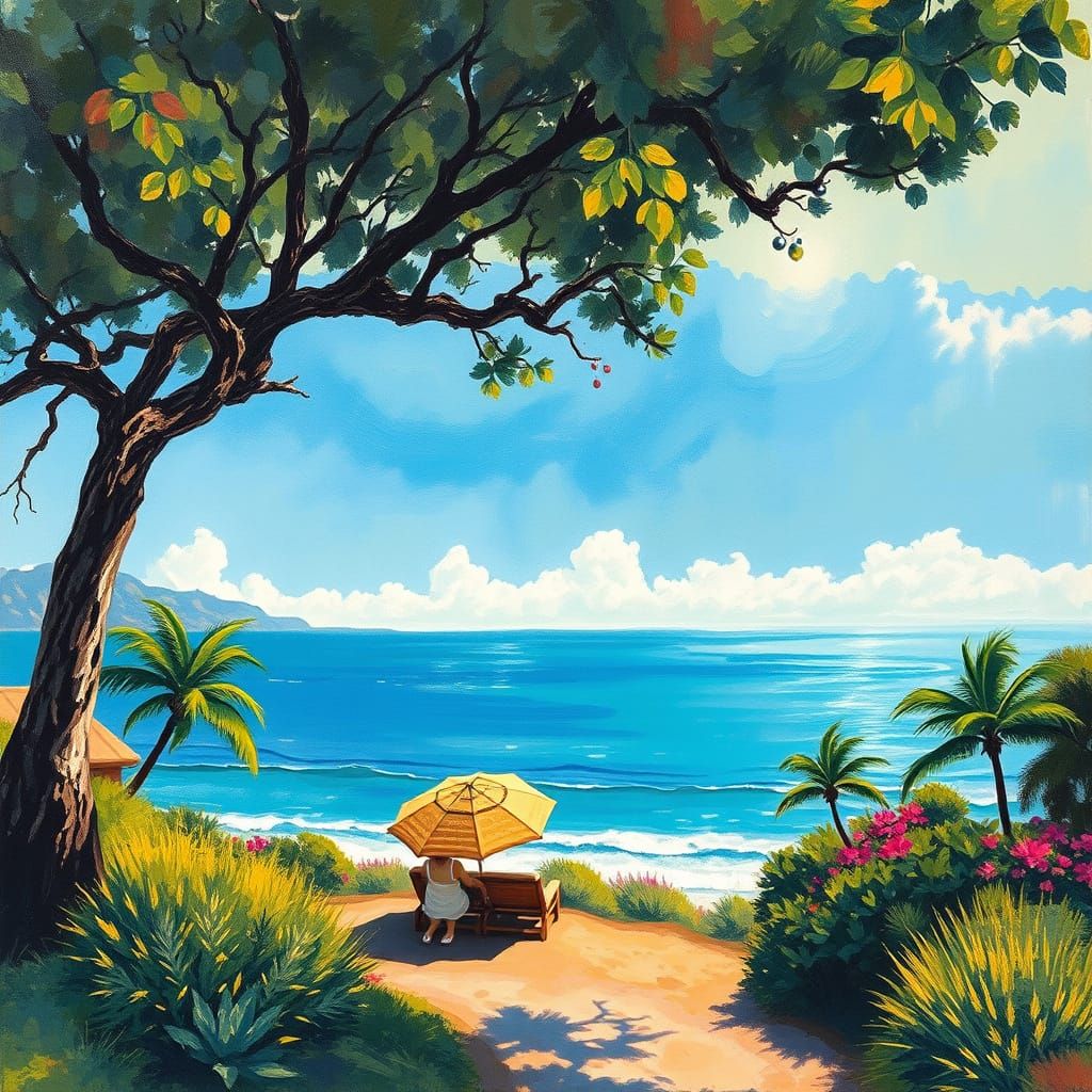 This image depicts a serene and vibrant vacation landscape with thick brush strokes and textured details, reminiscent of museum-quality impressionist masterpieces, featuring high contrast and polychromatic colors.