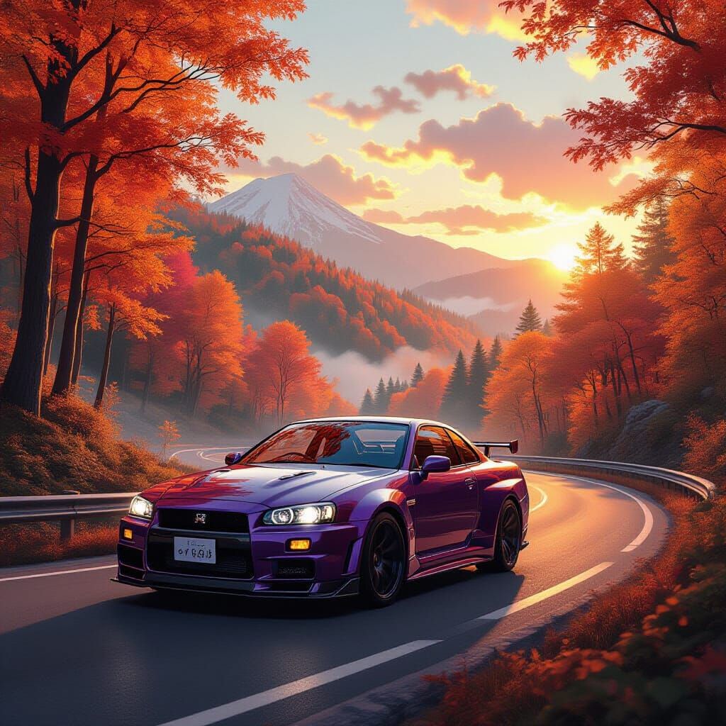 This image shows a Nissan Skyline GT-R driving through a forest. The car is surrounded by autumn foliage, and the scene is bathed in warm, golden light, rendered as photorealistic digital art.
