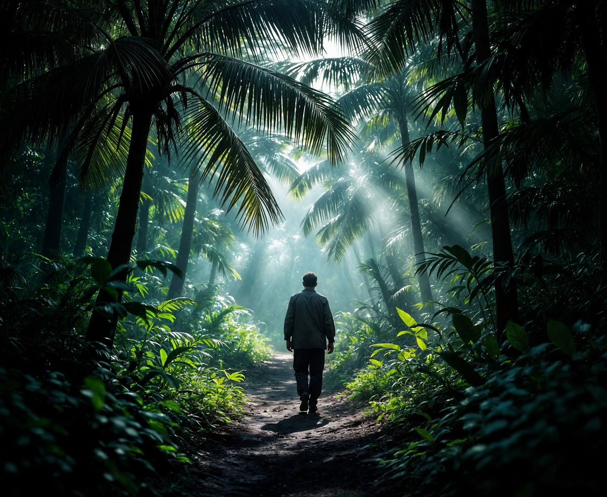 A grainy image shows a solitary figure in a misty Suriname forest, sunlight filtering through palm trees. The muted colors and soft focus evoke a sense of vintage mystery.