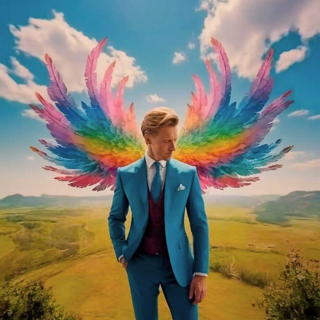 This image shows an abstract musical angel in airbrush art style. The artwork features photorealistic elements, analogous colors, pearly softness, and maximalist details.