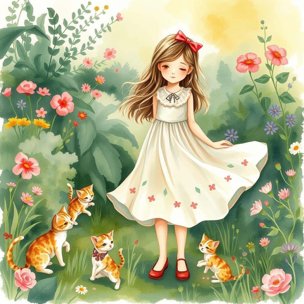 This image shows a girl in a flowing dress amidst playful kittens in a vibrant garden. The scene is depicted in a whimsical watercolor style, with soft colors and dreamy qualities.