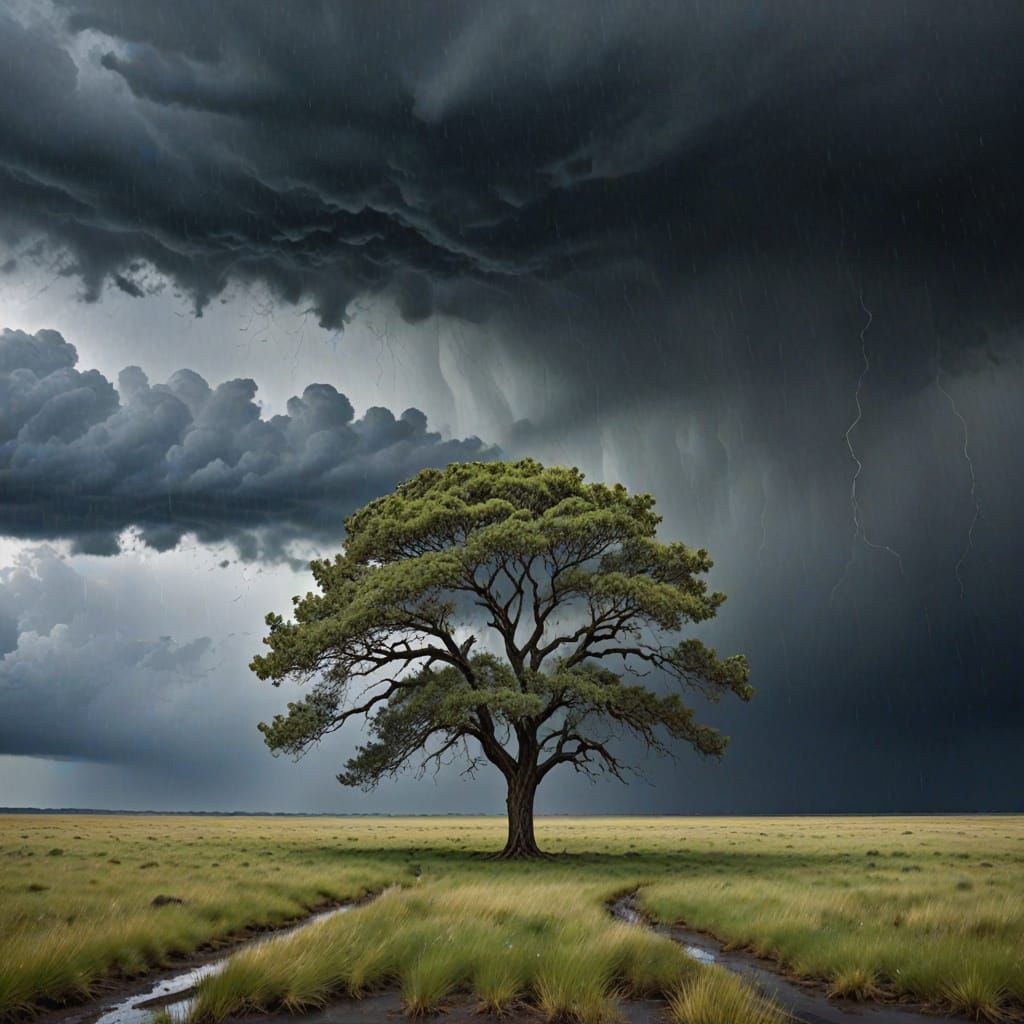 This image shows a lone tree on a plain under dark, swirling clouds, with rain falling. It features evocative brushstrokes in earthy tones, capturing a moody, textured atmosphere.