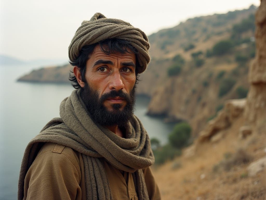 A candid photograph of a 33-year-old Galilean man in a worn tunic on a rocky hillside overlooking the Sea of Galilee. The image captures a candid moment with high detail and warm sunset light.
