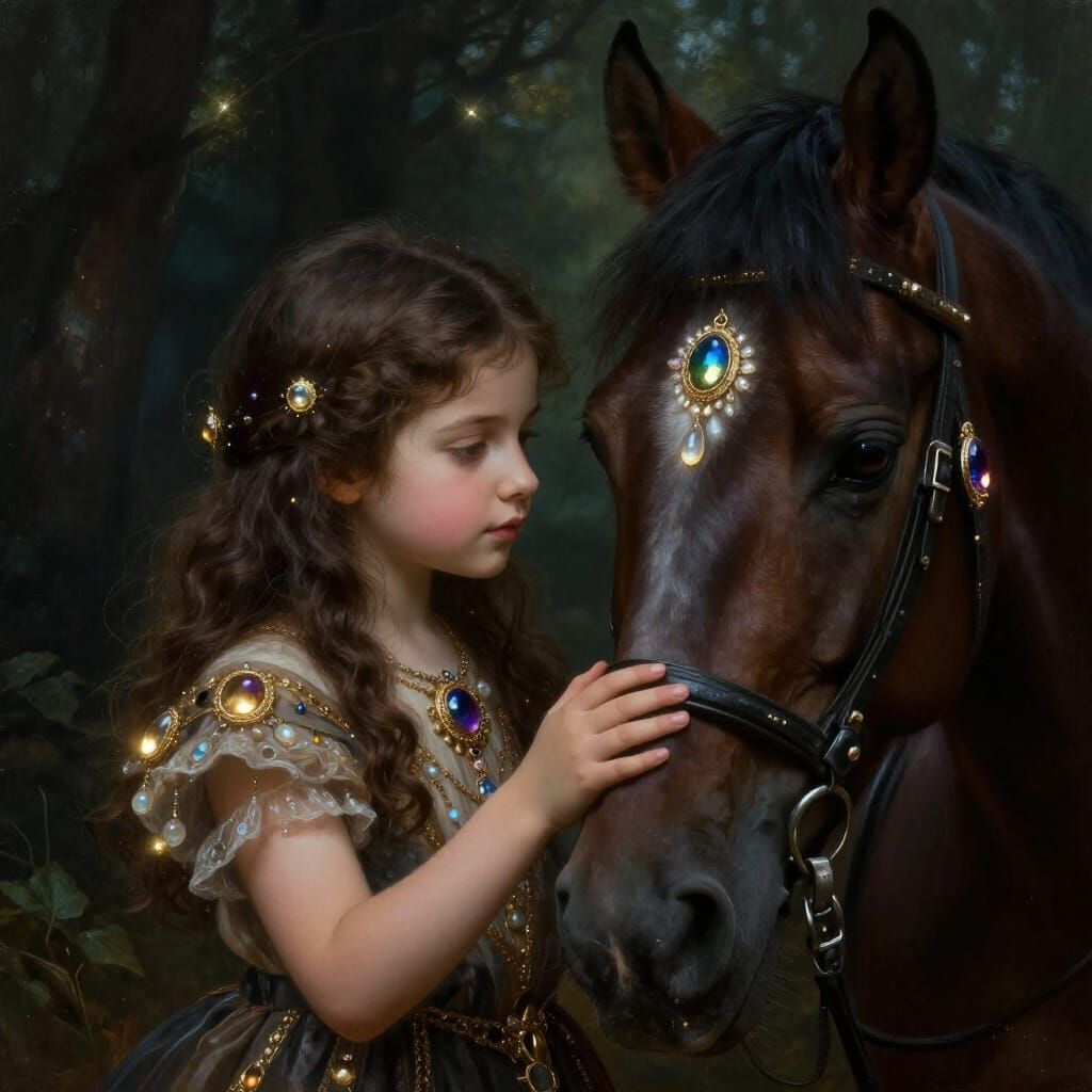 This hyperrealistic digital painting features a close-up portrait of a young girl and her horse, showing their deep friendship. Rendered in a dramatic baroque style with rich jewel tones and chiaroscuro lighting.