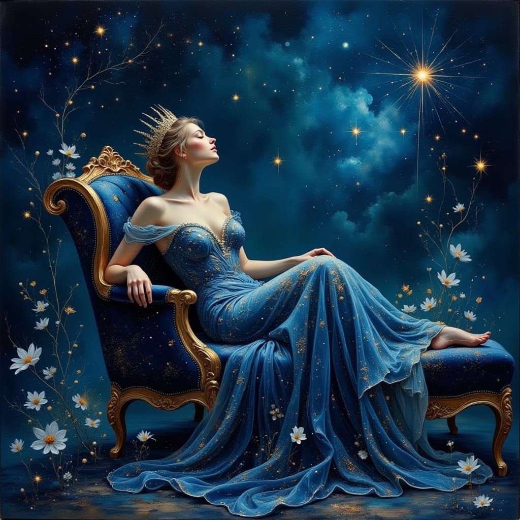 A digital painting shows a celestial queen reclining among stars. She wears a gown of deep cosmic blues, in an ethereal and magical flux, reminiscent of divine oil paintings.
