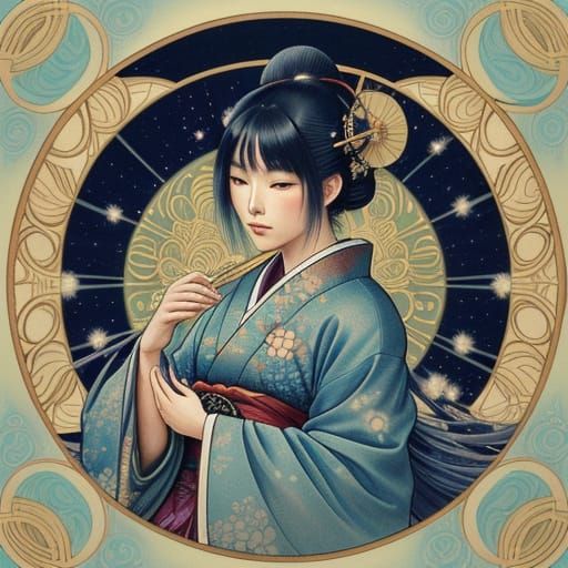 This image showcases a serene geisha surrounded by an ethereal mist, her fur adorned with delicate, swirling star patterns in a soft, dreamlike setting, reminiscent of Japanese Art Nouveau with a touch of celestial magic
