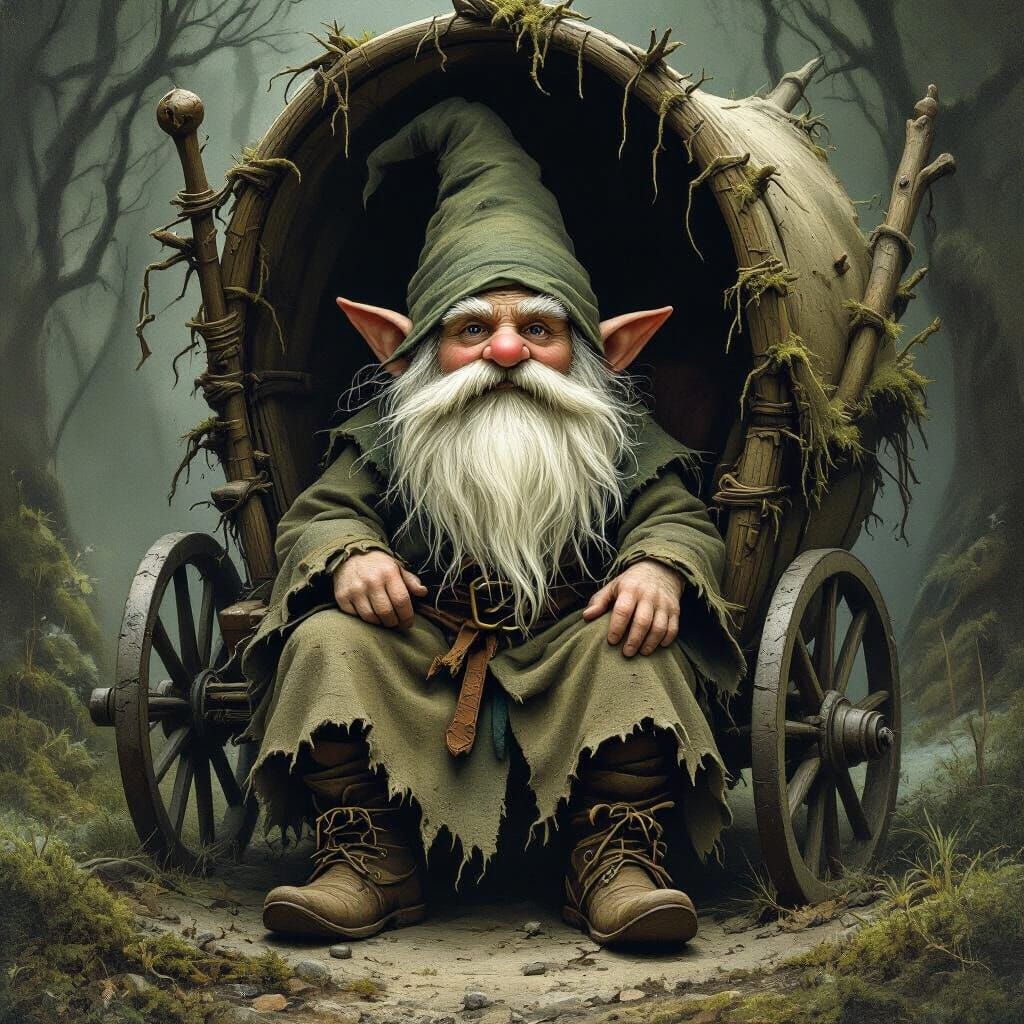 This image shows a spectral gnome in earthy robes seated in an ornate cart. The scene is rendered with ethereal lighting and mossy colors, reminiscent of fantastical illustrations.