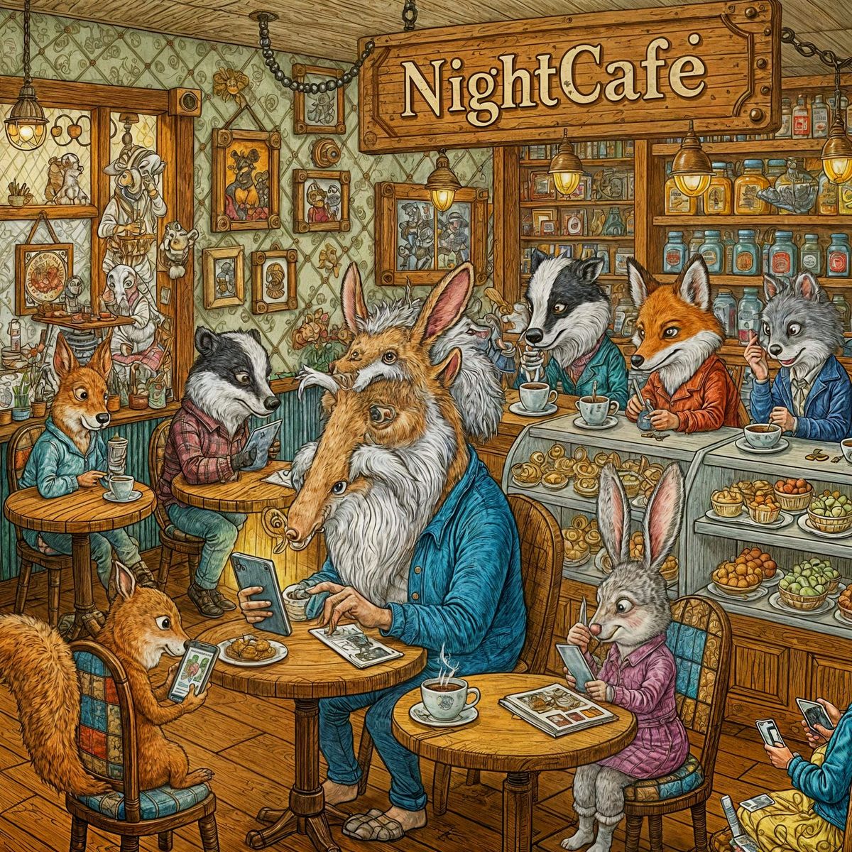This image shows anthropomorphic animals, including an old aardvark with a beard, engrossed in their smartphones at a coffee shop. The illustration features a detailed, textured, and whimsical cartoon style.