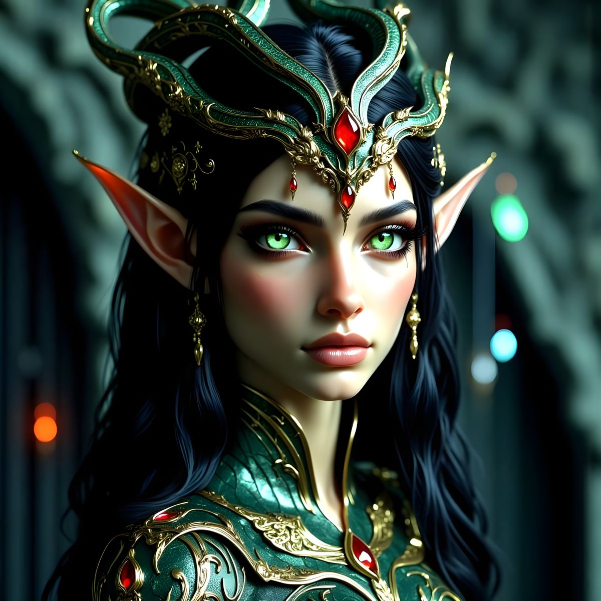 A striking portrait of a snake-headed elven princess. The image showcases a blend of beauty and the macabre, with the princess depicted as both regal and bloodthirsty.