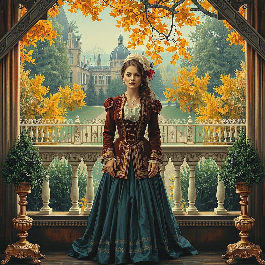 A person in vintage clothing stands in a serene French countryside. Soft, golden light illuminates intricate details, blending realism with romanticism in a Rococo style.