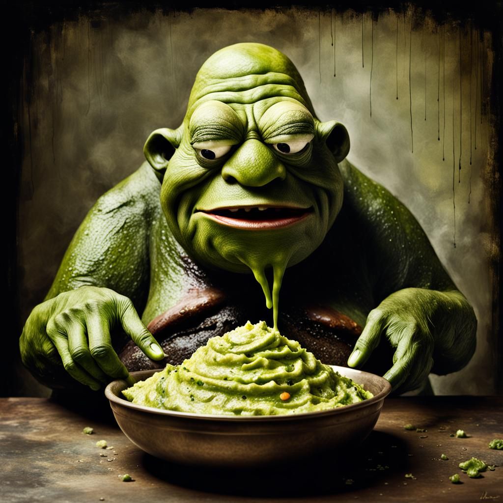 A surreal photograph of a demonic, obese, cyborg bear in a volcanic jungle. This highly detailed portrait features glowing eyes and a blend of artistic styles in a hyperrealistic, cinematic composition.