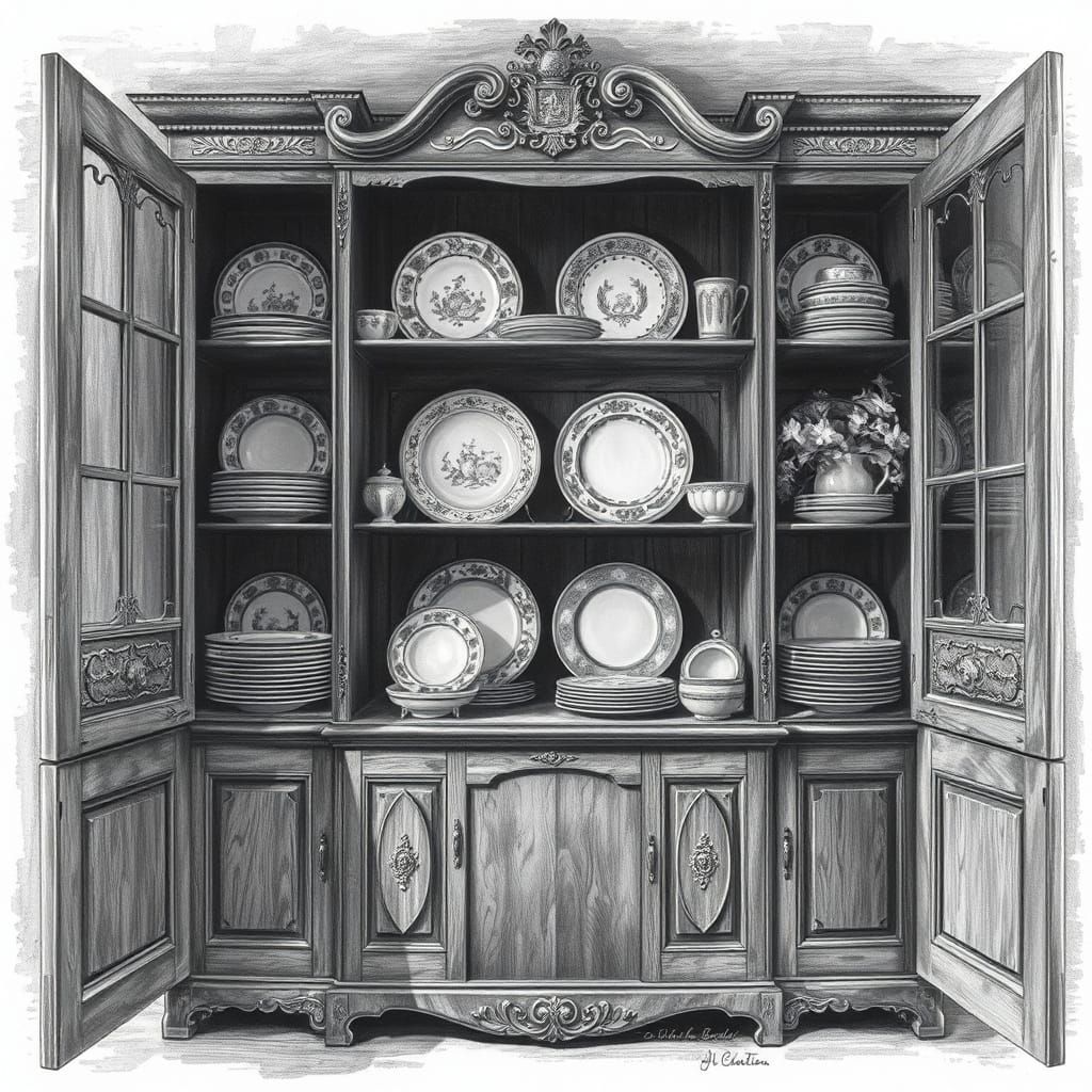 This image shows a meticulously rendered charcoal drawing of a china cabinet overflowing with delicate china plates, showcasing exceptional detail and craftsmanship.