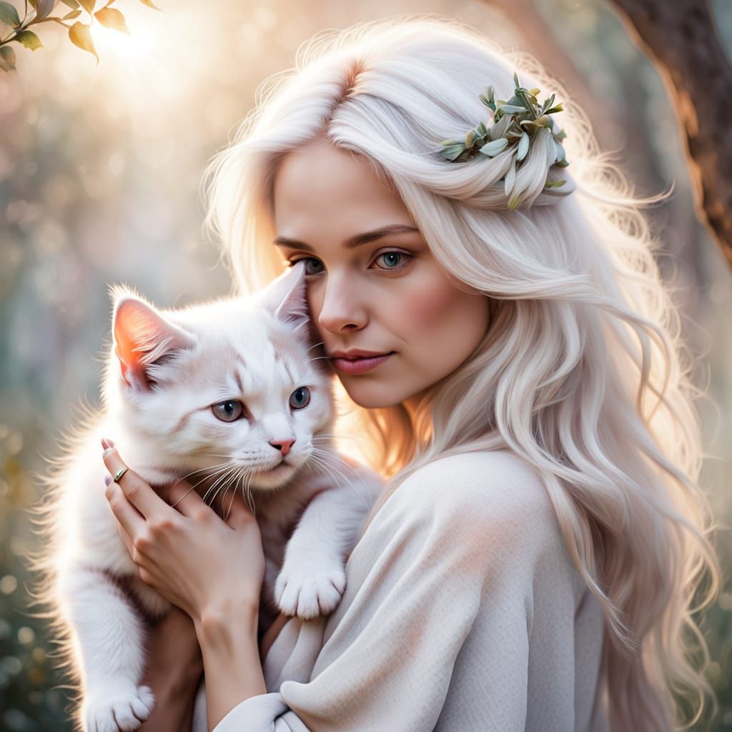 This enchanting watercolor-style painting features a serene woman embracing a soft white kitten amidst a mystical fog, with warm sunlight and rustic textures creating a sense of calm and wonder.