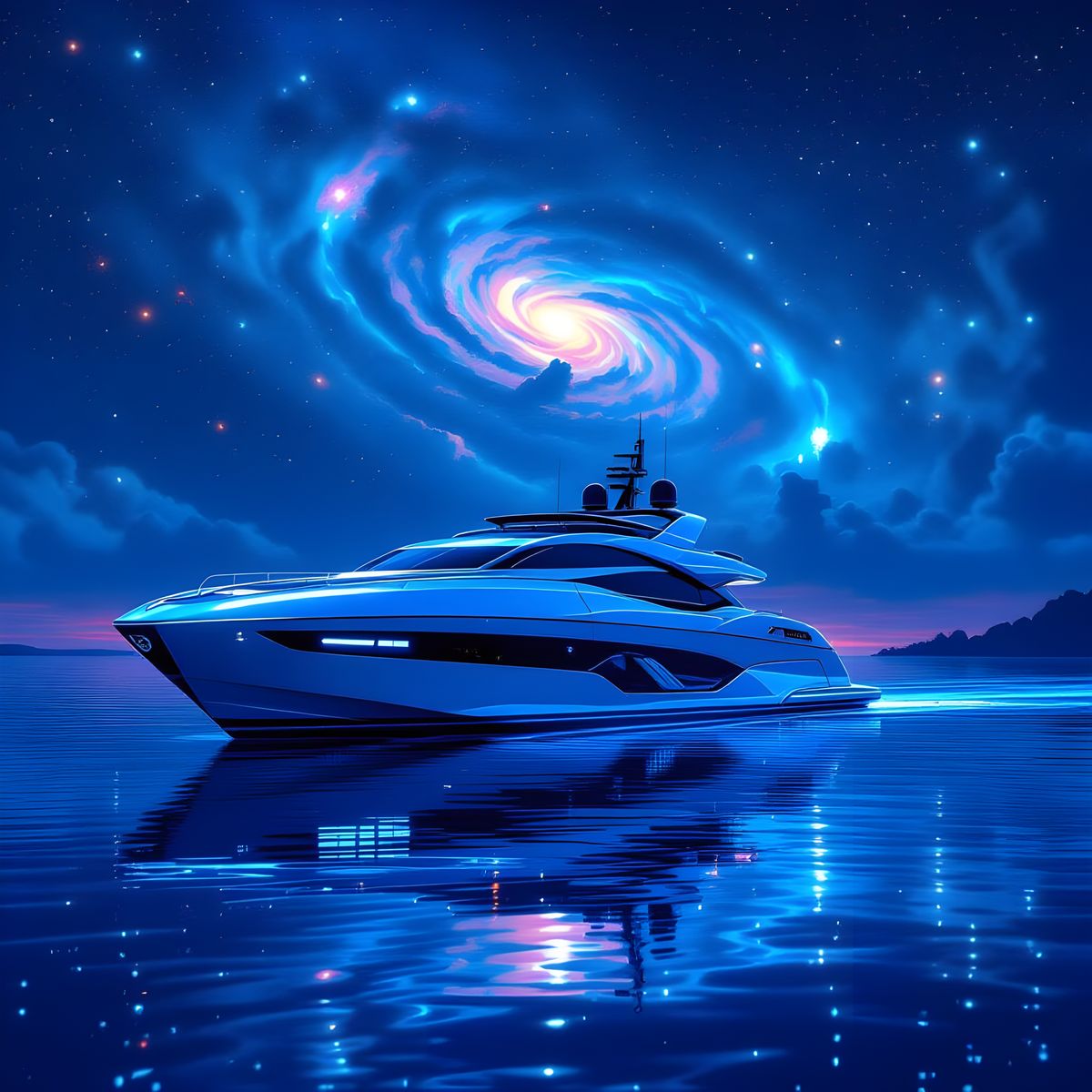 This image shows a luxurious yacht sailing on a bioluminescent lagoon under a vibrant night sky. The scene is rendered as intricately detailed digital art, with rich colors and a futuristic aesthetic.
