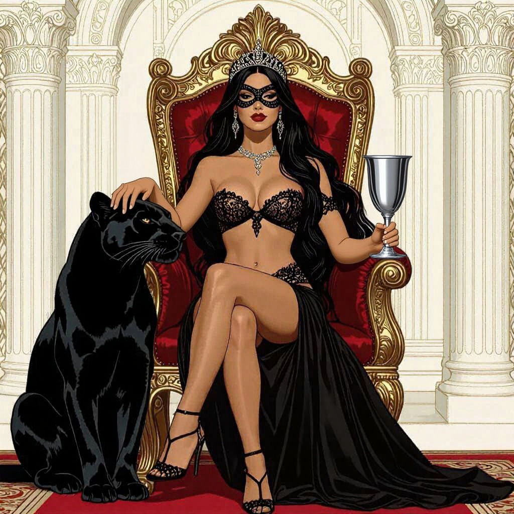 This image shows a Latina woman with long black hair wearing a black lace mask and bikini, seated on a gold throne with a panther at her side. She is depicted in a regal pose, holding a goblet.