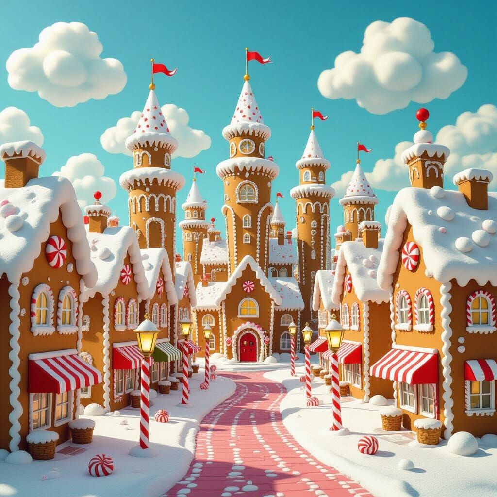 A vibrant cityscape made of confectionery delights. Gingerbread buildings tower over candy cane lights under marshmallow clouds. The image is rendered with clean lines and playful textures in a hyperrealistic style.
