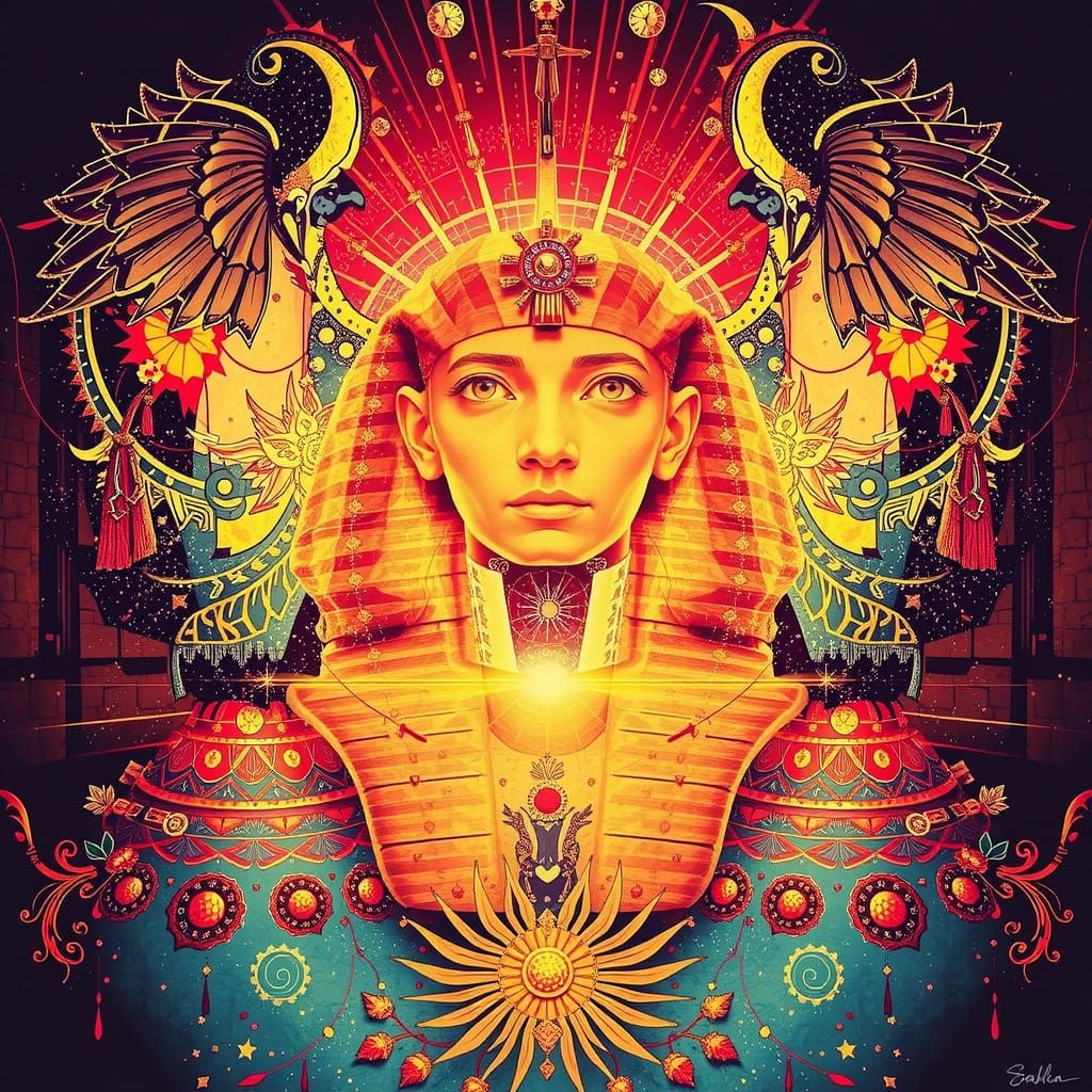 This vibrant image showcases a meticulously crafted sphinx in a stunning display of triadic colors, exuding brilliance and perfection.