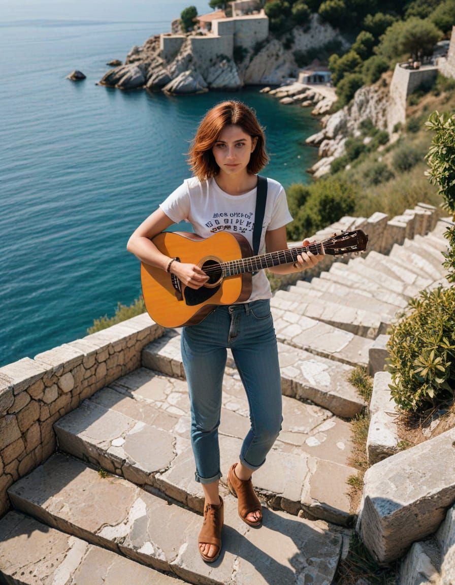 This image shows a woman with auburn hair and hazel eyes playing an acoustic guitar on stone stairs overlooking the Adriatic Sea. She wears a vintage band t-shirt and jeans.