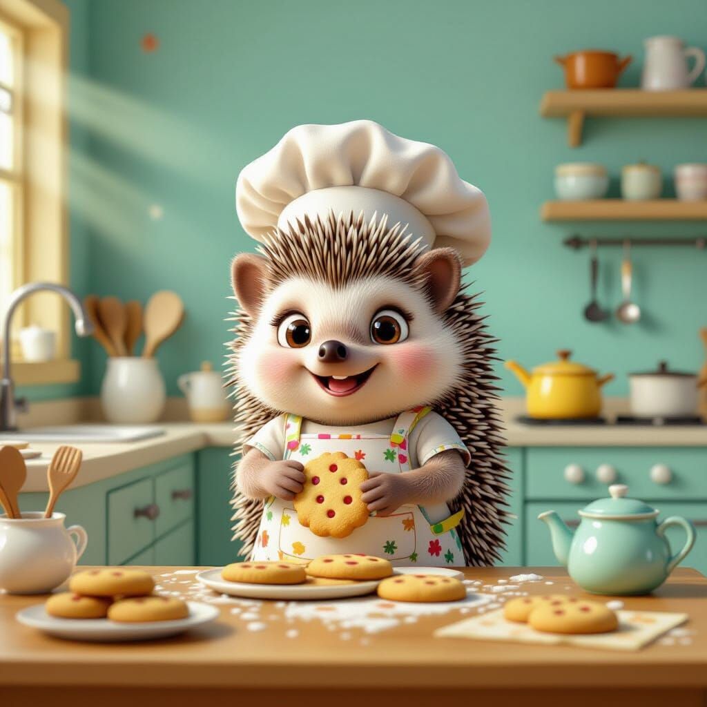 This image shows a small hedgehog wearing an apron and hat baking cookies in a kindergarten setting. The scene is rendered as 3D digital art in the style of a children's cartoon book.