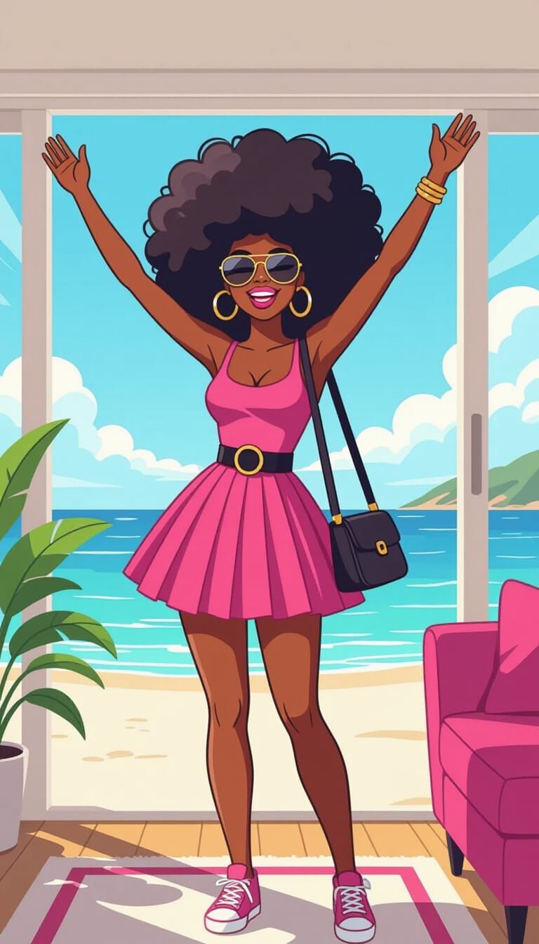 This image shows a stylish Black woman in a pink dress and afro, striking a pose in her sea-view living room. The art style features bold lines and vibrant colors, reminiscent of a modern 2D cartoon.