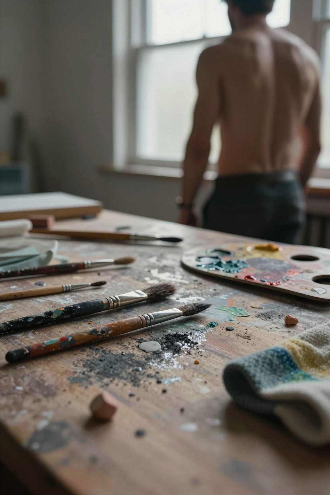 This image shows a creative worktable mid-process, with art supplies scattered naturally. A silhouetted figure stands in the background, bathed in daylight, in a contemplative pose.