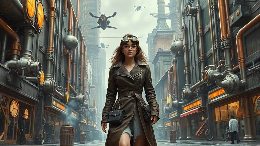 A woman in goggles stands on a city street amid steampunk technology. The futuristic scene features flying vehicles and blends elements of futurism and dreamlike landscapes in a photorealistic style.