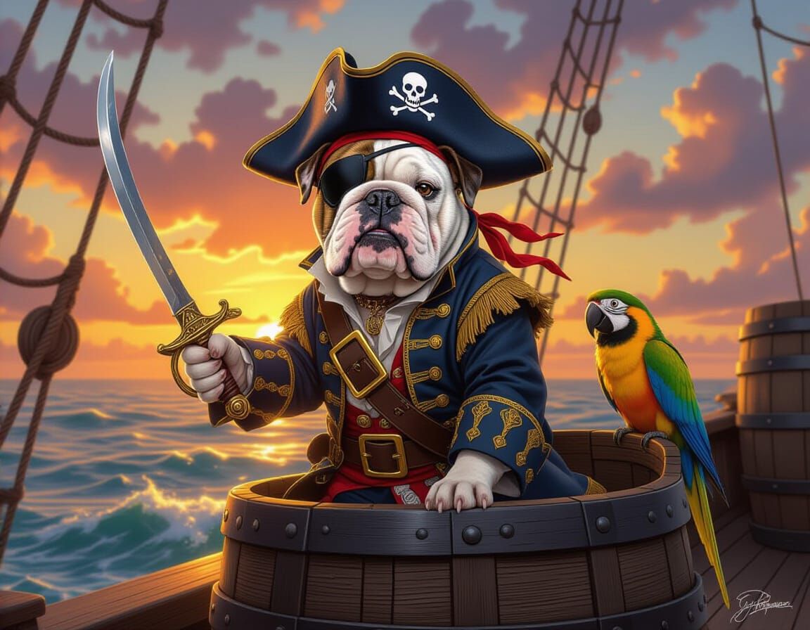 This image shows a bulldog dressed as a pirate on a ship. The canine swashbuckler wears a tricorn hat and eye patch, holding a cutlass, with a parrot on its shoulder. The image is a digital painting with a shiny aura.
