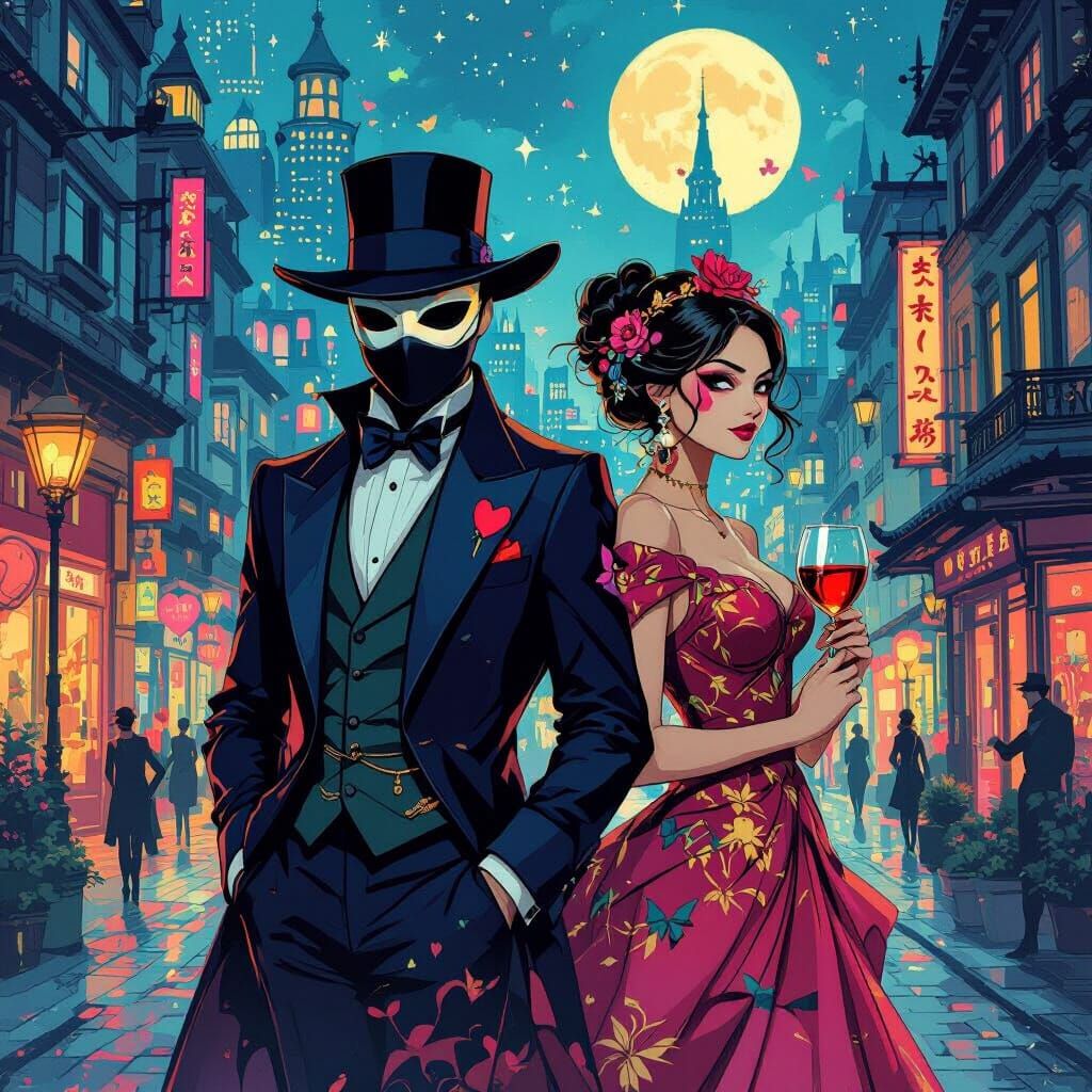 This image depicts masked figures in stylish clothing taking hearts against a magical night city. The art style features dynamic brushstrokes and bright colors, reminiscent of a graphic novel.