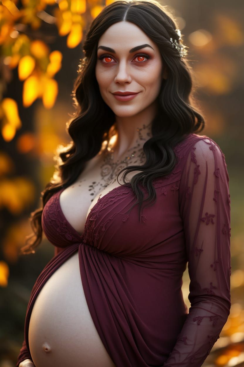 This image shows a beautiful pregnant woman inspired by Nya from Demonbane, depicted in an elegant Art Nouveau style. Her eyes radiate love as she gazes at the viewer, with a warm, glowing aura against an autumnal background.