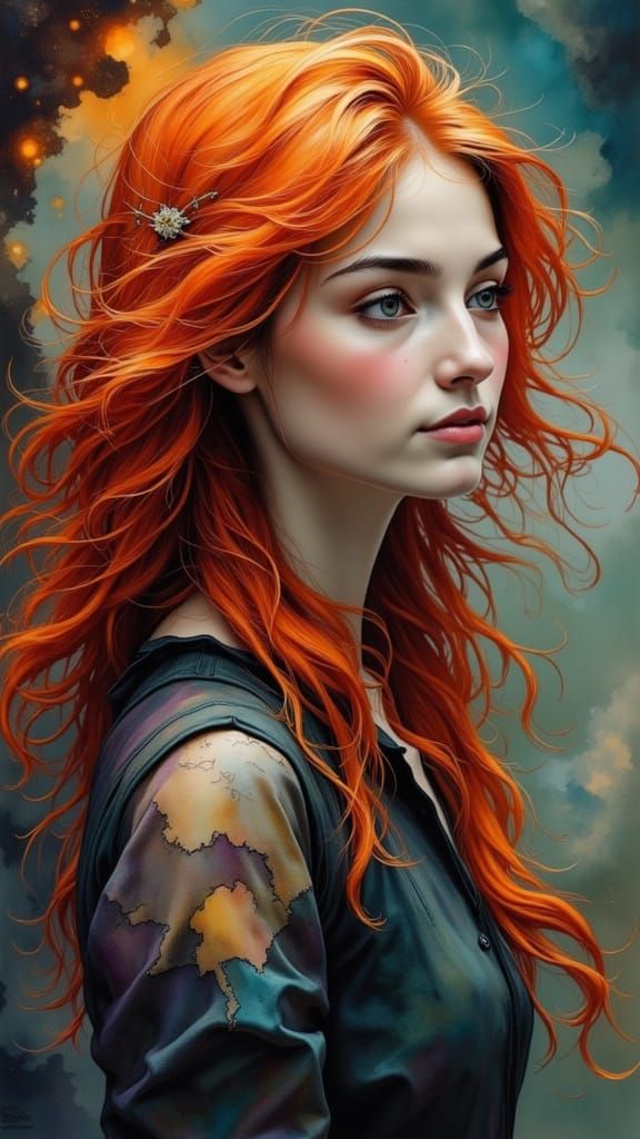 A digital rendering of a beautiful woman with rainbow hair. The image evokes themes of magic and healing, set against the deep red backdrop of a witches' kingdom.