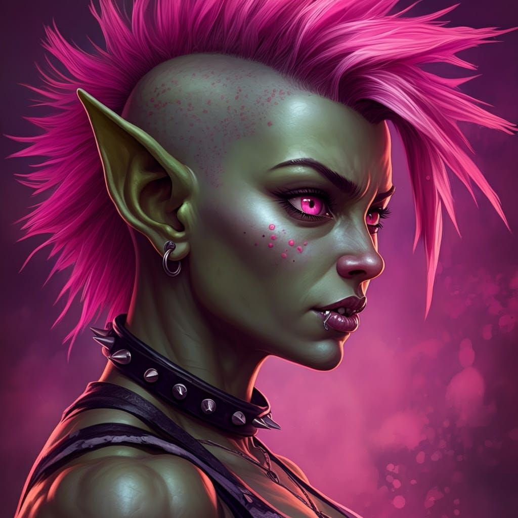 This image shows a dramatic, hyperrealistic depiction of a punk rock goblin girl with striking pink eyes. The intricate details and vibrant colors create a captivating scene.