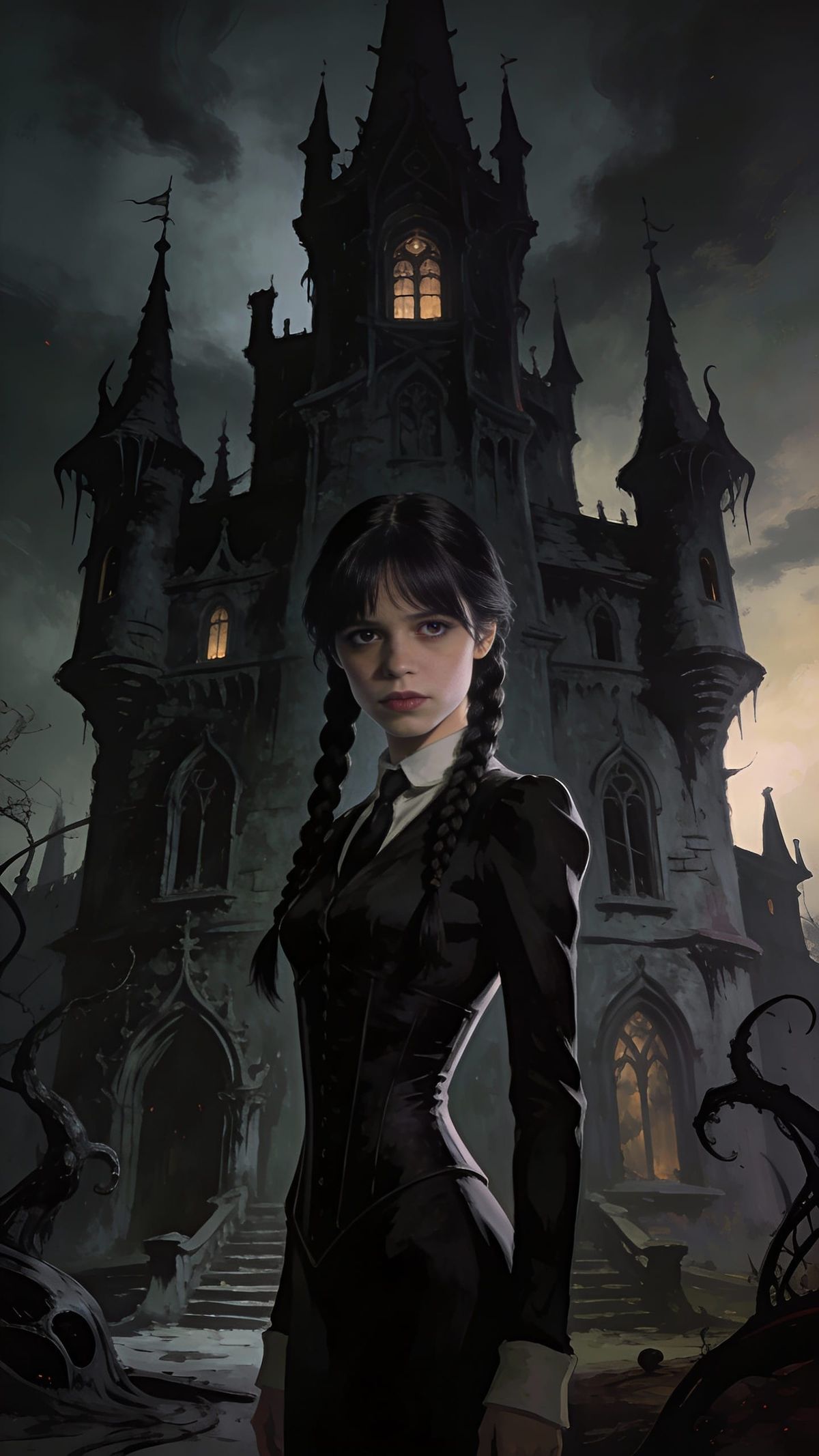 A semirealistic digital illustration featuring Wednesday Addams before a menacing gothic castle. Rendered with a painterly aesthetic, dramatic lighting, and a muted color palette, evoking dark fantasy.