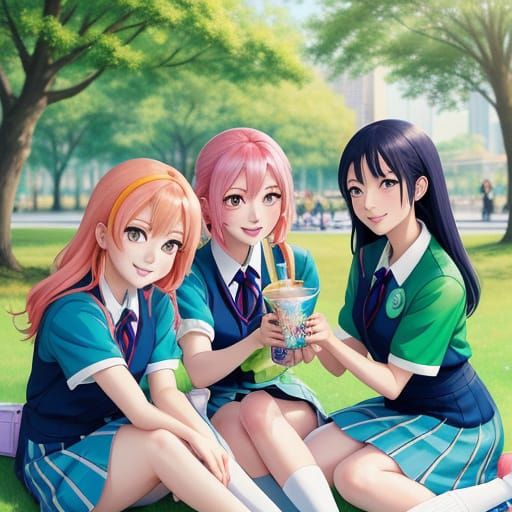 This image shows a group of teenage girls in matching uniforms drinking bubble tea on a picnic blanket. It's a vibrant manga illustration with soft pastel colors and sparkling eyes, capturing joyful youth in a lush park setting.