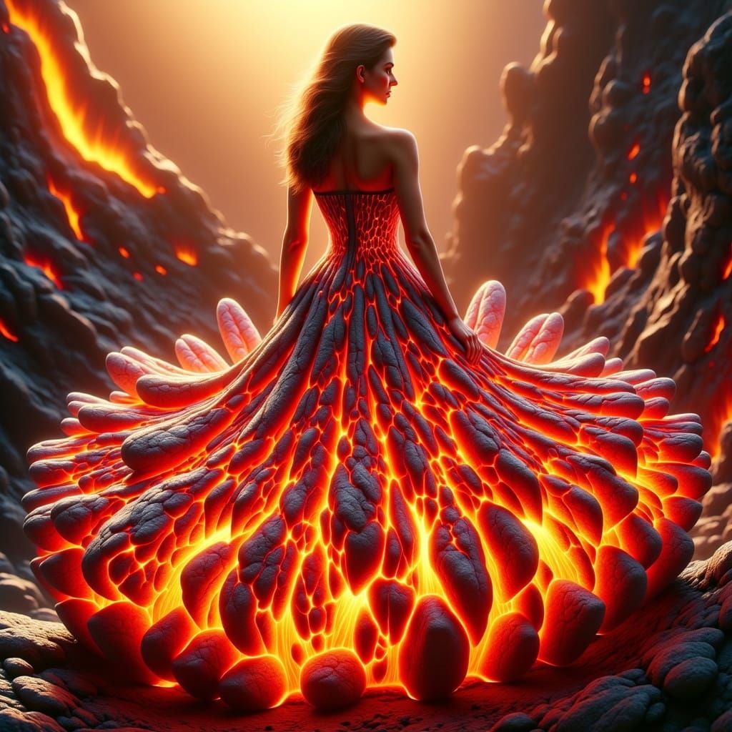 This image shows a stunning female figure standing on a sea of lava, surrounded by a majestic, rotating petal skirt and corset, both crafted from molten magma. Golden hour light illuminates the scene, with sparkling dust particles adding a touch of magic to the background.