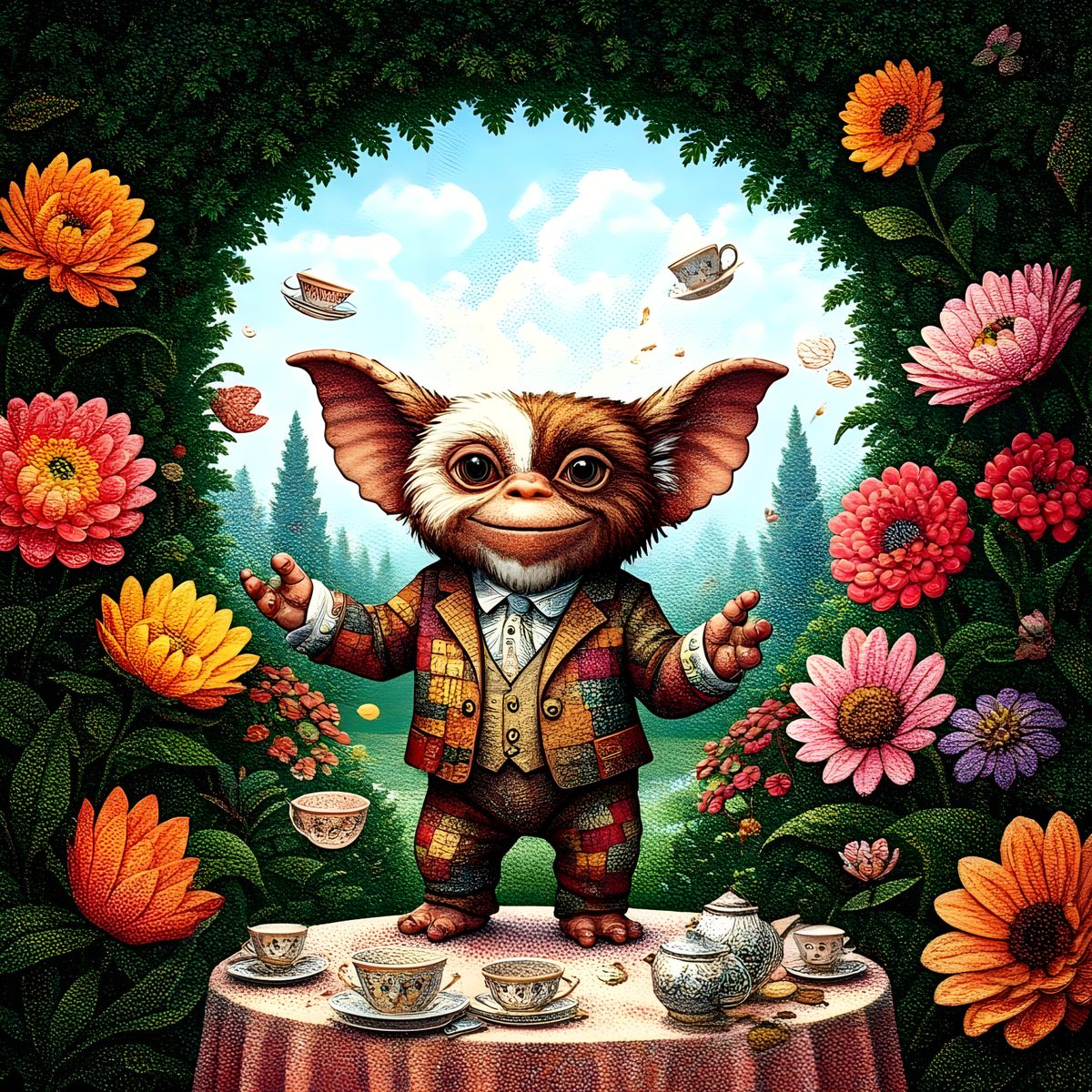 A playful gremlin causes chaos at a high-society tea party in a fantastical garden filled with oversized flowers and teacups, set in a pointillist and maximalist style with a vibrant color palette.