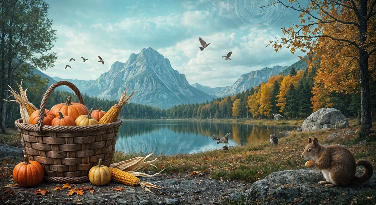 This image depicts a rustic basket of autumn harvest before a serene lake and mountains, with birds migrating overhead. It evokes a surreal, dreamy fantasy with soft turquoise light and swirling patterns.