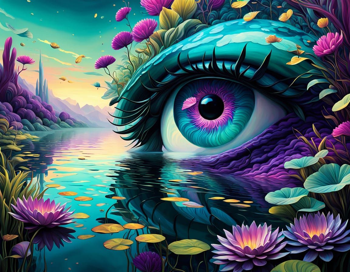 This image shows a tranquil lake mirroring morphing clouds in a surreal landscape. Giant stylized eyes emerge from the ground among luminescent plants in vibrant expressionism. Rendered as digital painting.
