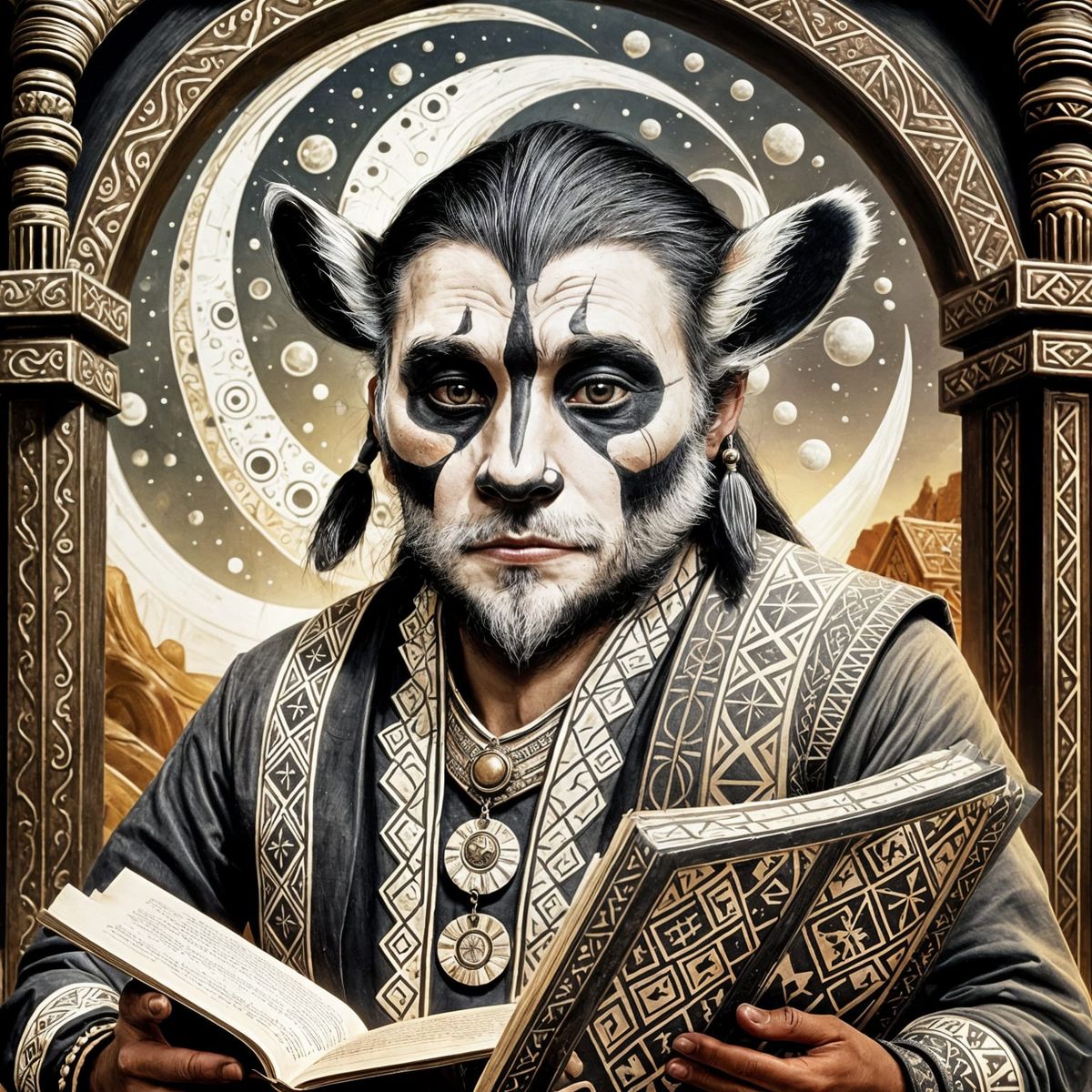 This image depicts a textured moonscape scene inspired by Aztec culture, featuring a figure with a low-poly, face-zero aesthetic in a style reminiscent of Rick Tulka's brushwork.