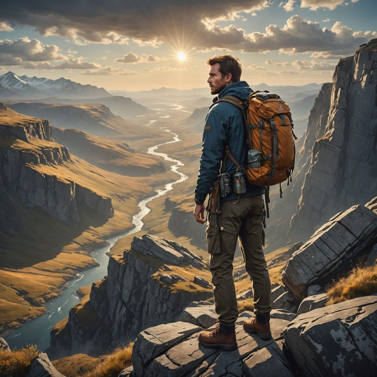 A striking picture of an adventurer on a cliff, gazing over a wild landscape. The digital painting highlights their determined expression and the cinematic atmosphere.