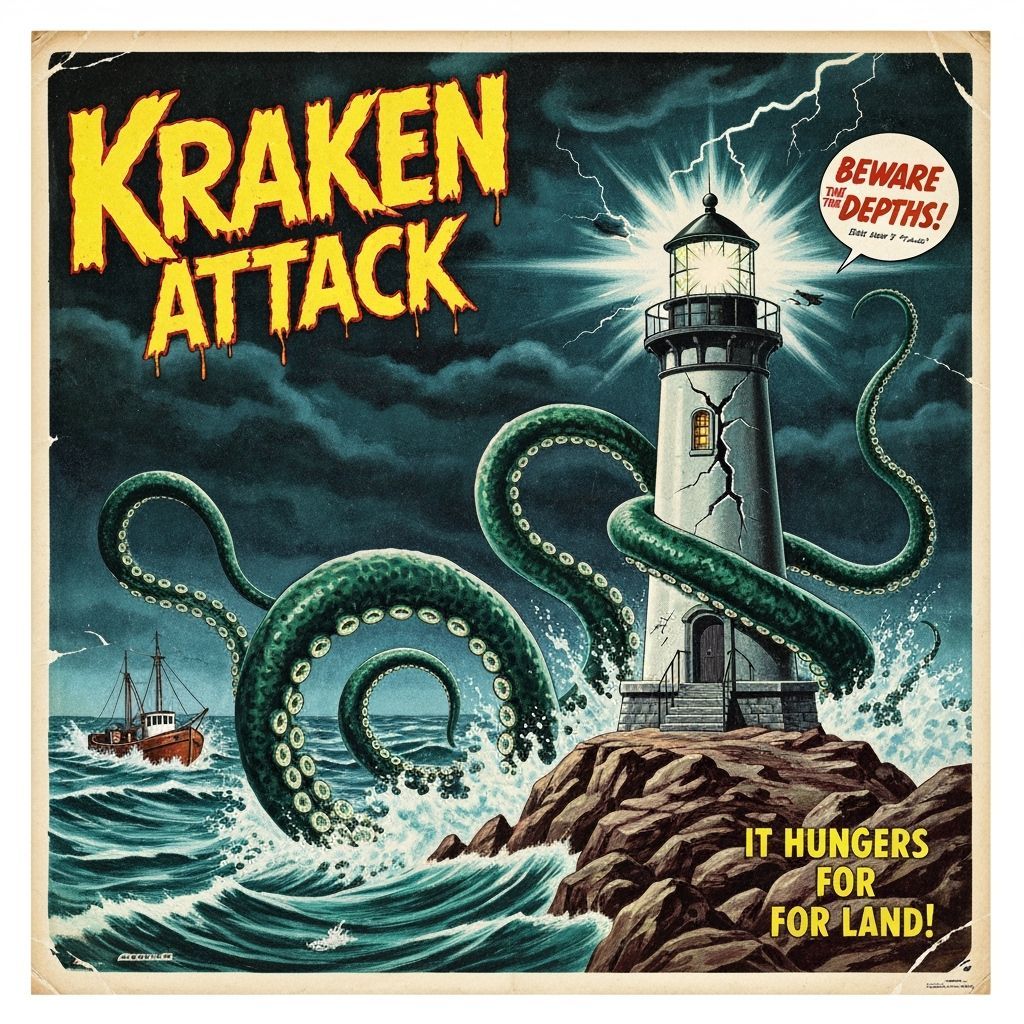 This image shows a vintage B-movie poster from the 1950s, depicting a kraken attacking a lighthouse during a storm. The poster features bold colors, dramatic lighting, and pulp-style taglines.