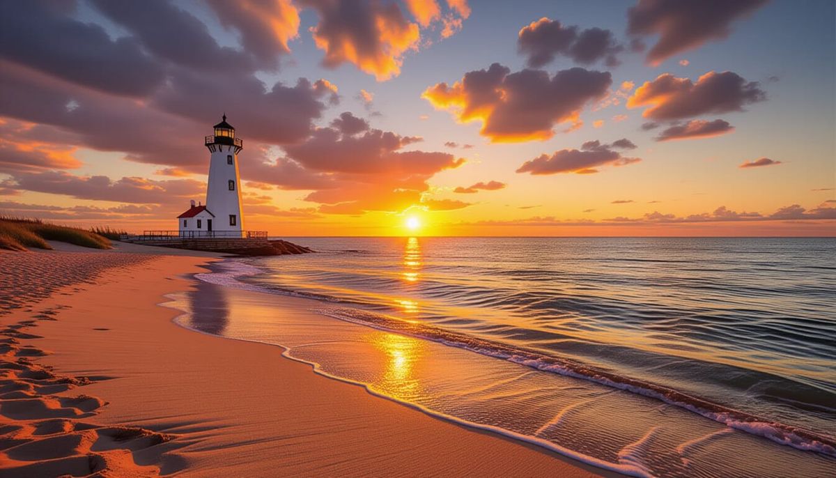 This image showcases a stunning panoramic photograph of a beach at sunset, dominated by a tall lighthouse. The golden sand and clear water reflect the vibrant colors of the sunset.