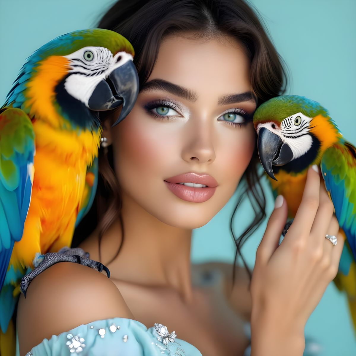 This image shows a photorealistic portrait of an attractive European woman with long, curly black hair and pastel blue and grey makeup, smiling and holding a parrot. She wears a blue dress with diamonds, captured in dramatic studio lighting.