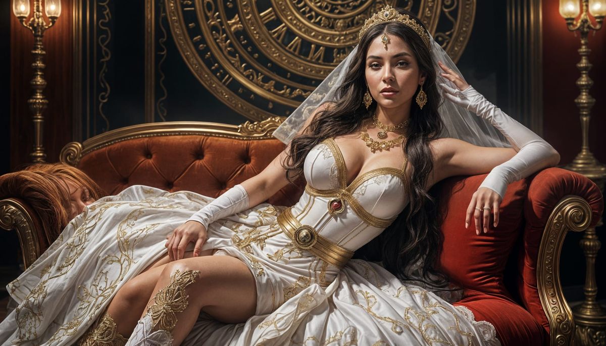 This digital art showcases a woman in evocative bridal wear on a futuristic red sofa. Featuring detailed features, high contrast, and a wide color palette, it's a vivid, high-quality masterpiece.