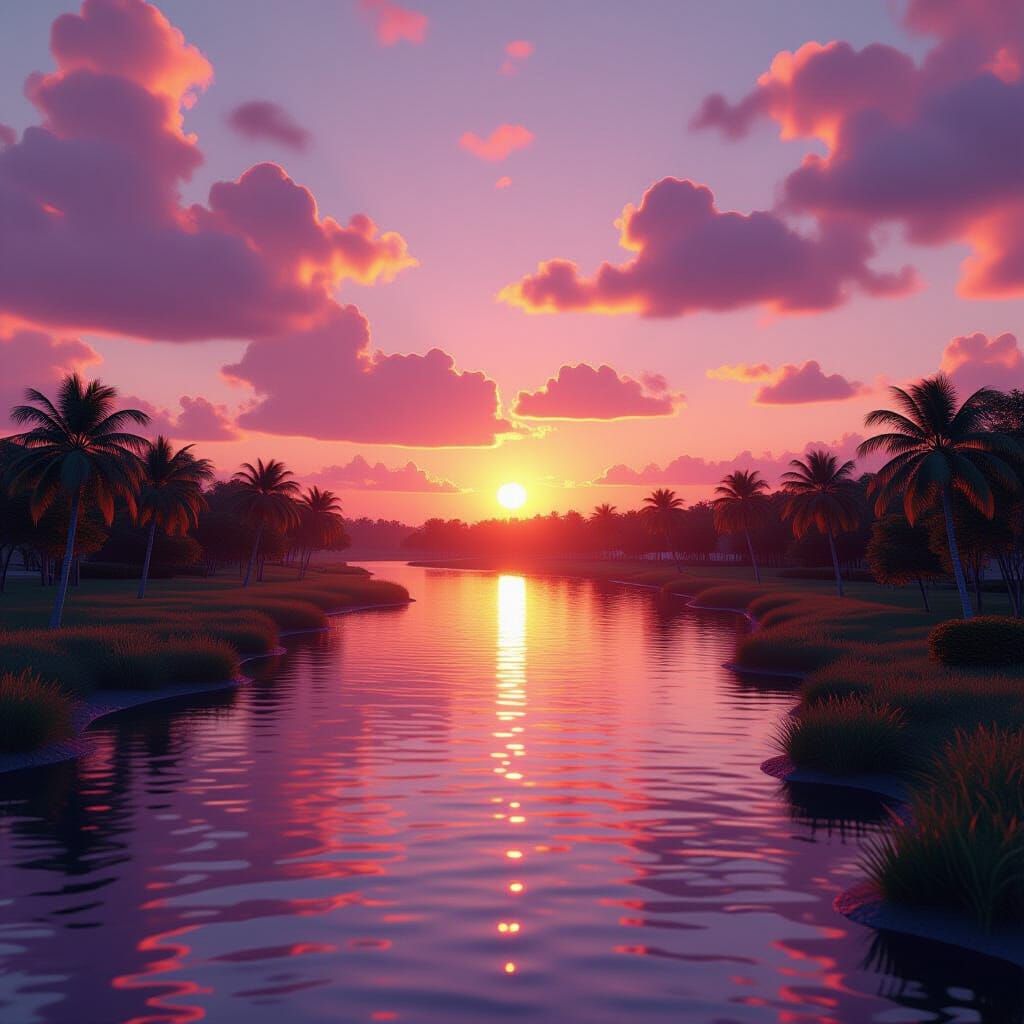 This image shows a vibrant sunset over a tranquil river. The colors blend seamlessly, creating a fantastical scene with intricate details and complementary hues, rendered as concept art.