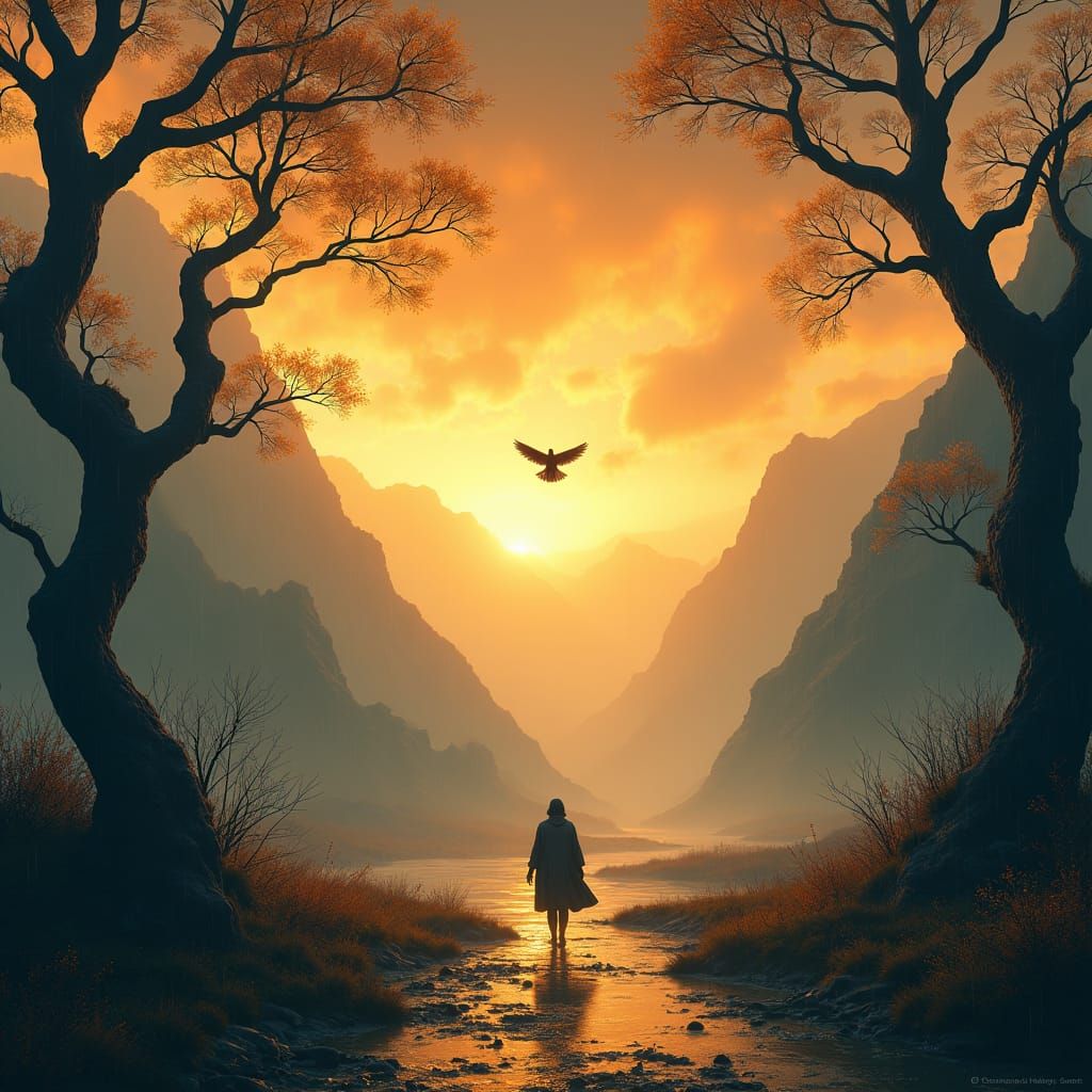 A dramatic image of a solitary figure walking toward a clearing storm. Golden light breaks through the clouds over a mountain landscape, with a lark in flight, rendered with high contrast and a deep color palette as fantasy concept art.