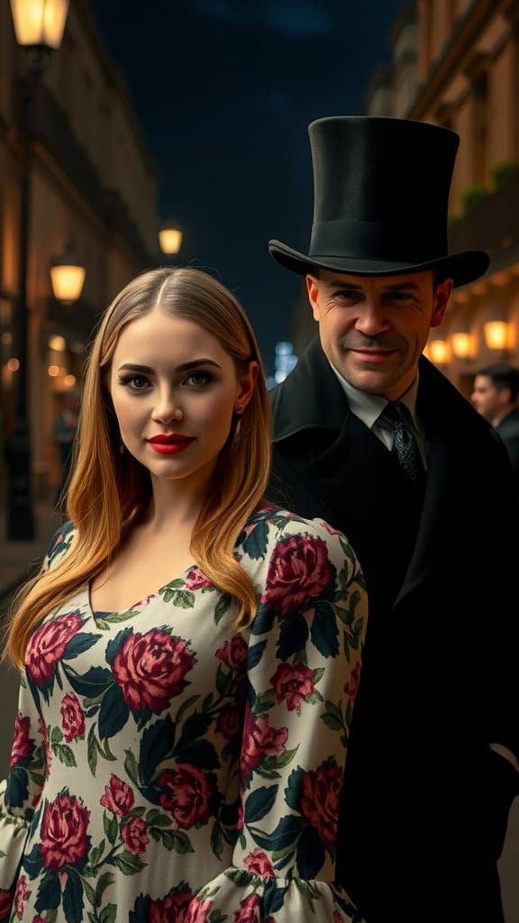 A cinematic film still captures a sinister man in a black hat and trench coat behind a blonde woman with red lipstick on a foggy 19th century London street at night. Shot with film grain and dramatic lighting.