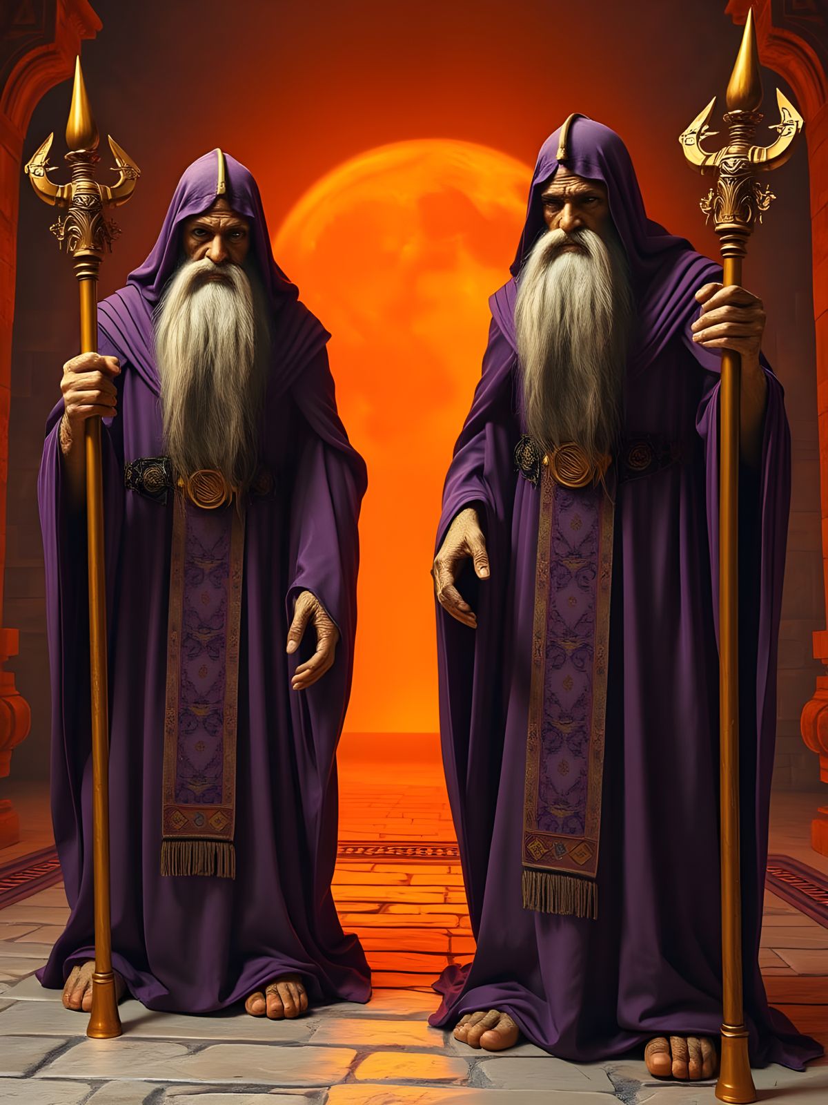A striking picture of two tall, ancient Egyptian priests with long beards and purple robes, holding golden staffs. Backlit by an orange glow, they stand as evil wizards in a fantasy world.