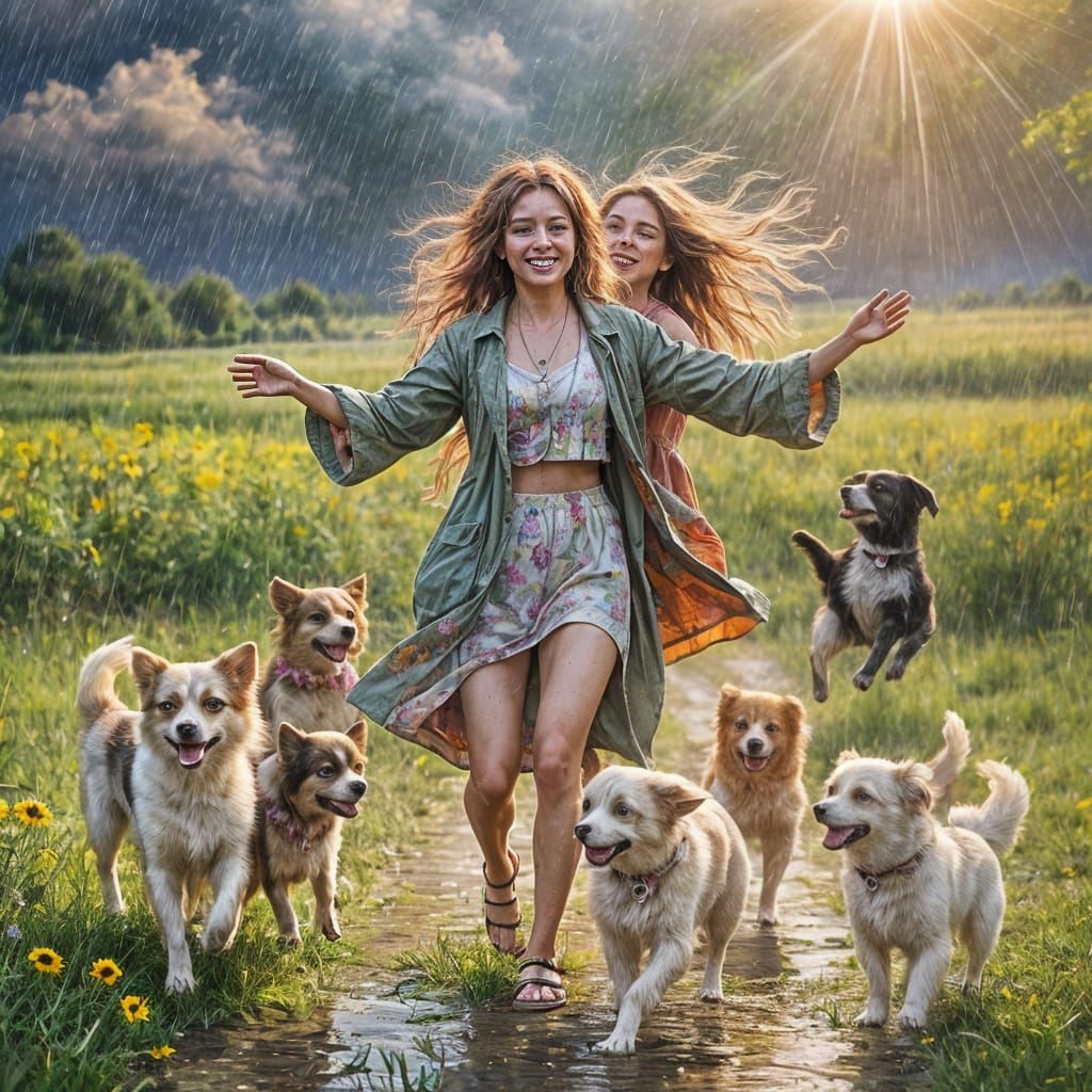A vibrant image of a hippie girl dancing joyfully in the rain with her dogs. The scene is bathed in soft, heavenly light with multicolored accents.