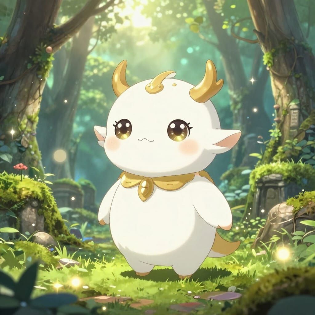 This image shows a cute anime fae with white and gold accents in a magical, overgrown ancient city. Soft light and bokeh effects create a dreamy, illustrative fantasy atmosphere.