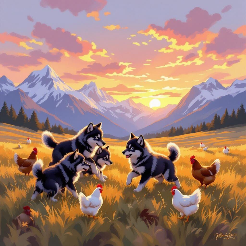 Fluffy wolf pups and speckled chickens play joyfully in a sun-drenched field with mountains at sunset. Rendered in a whimsical, painterly style with soft brushstrokes.